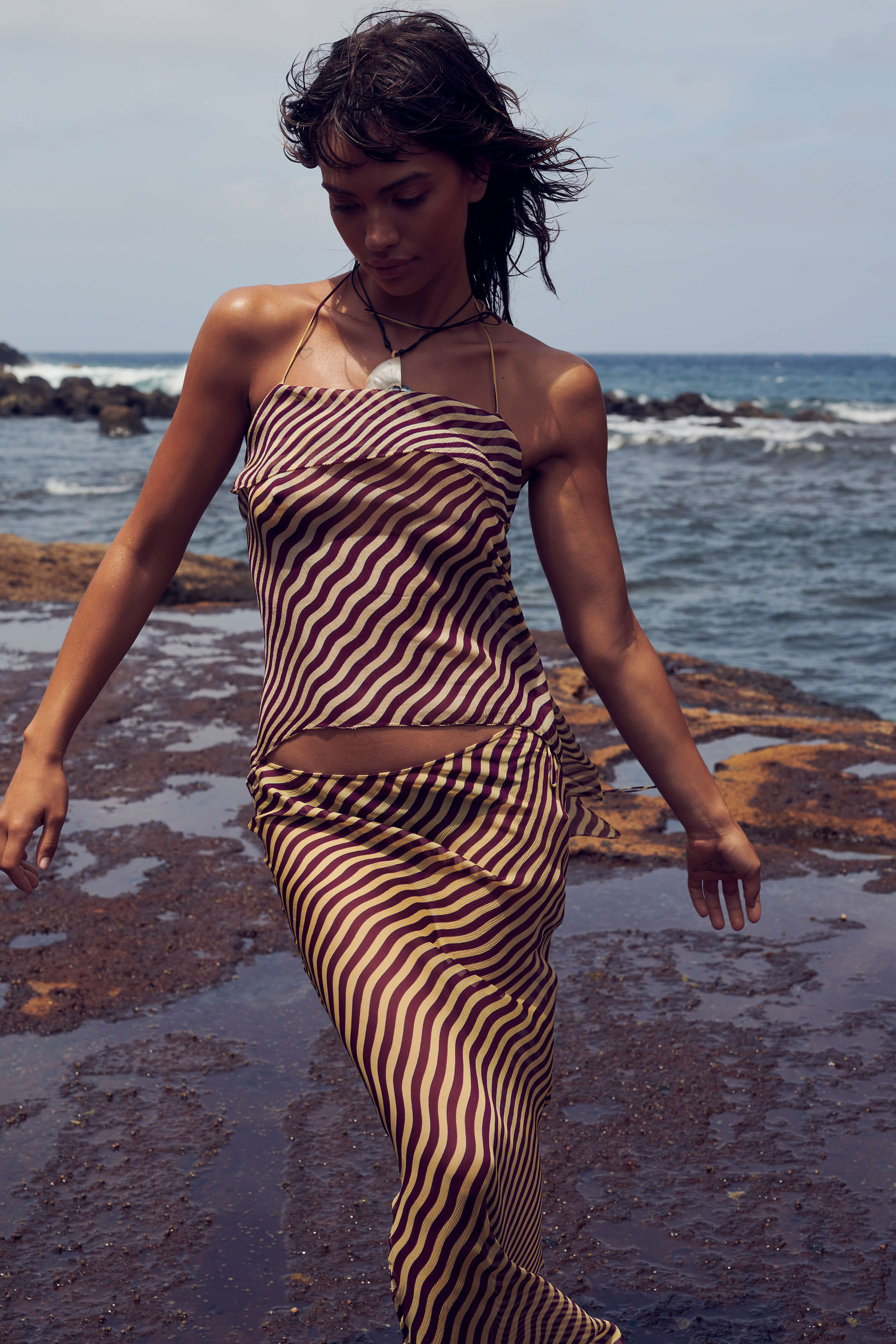 A wear-anywhere summer wardrobe staple, the 90s-inspired Assisi maxi skirt is printed with striking waves in a rich dark purple. Crafted from a sheer, luxurious crinkle chiffon, it's cut to a perfectly simple, sexily low-rise silhouette and finished with a train to the back and delicate waist ties.