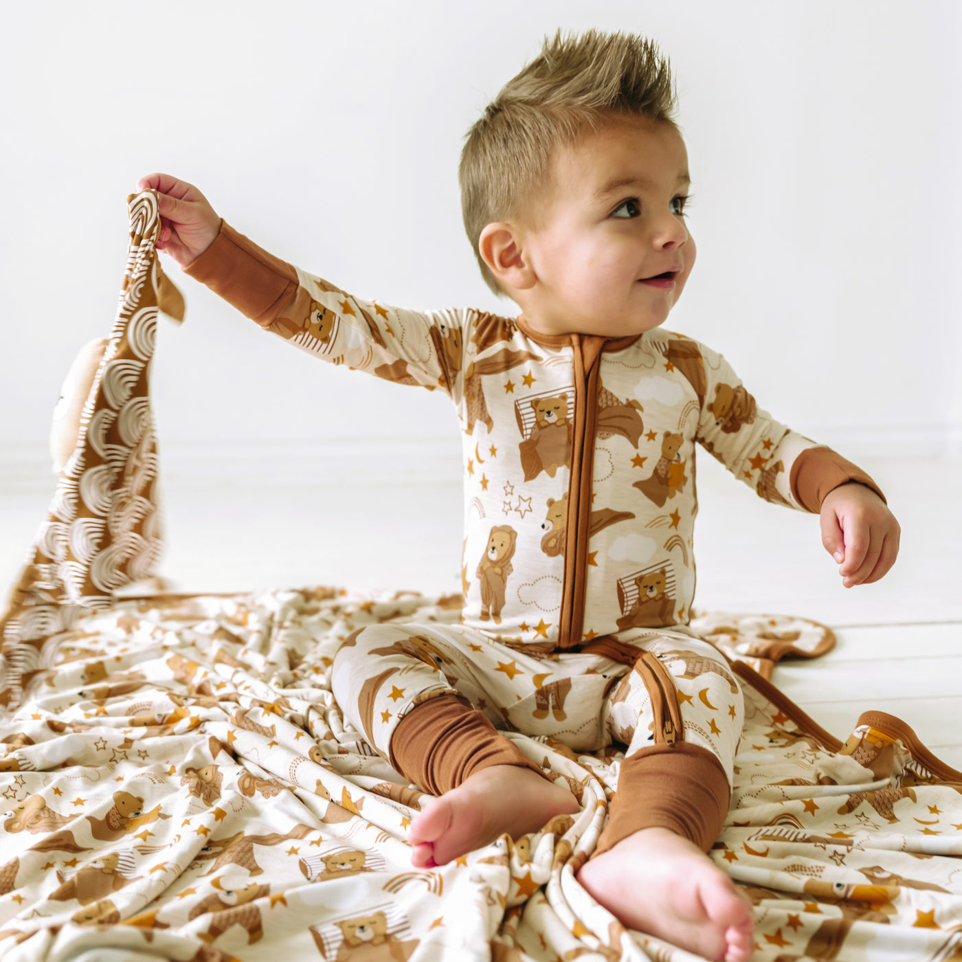 Sweet as can be! This Signature Cloud Blanket® features Bowie the Bear getting ready for bed in his Rust Rainbows jams. Made from three luxurious layers of our signature Lunaluxe® Bamboo, it's buttery soft and perfect for snuggling up with the ones you love.