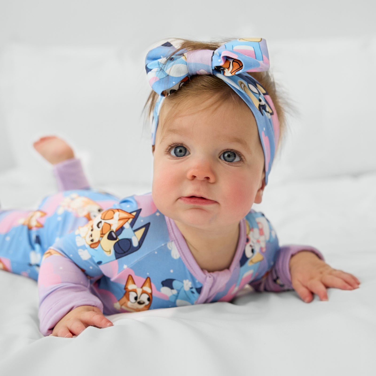 Top off their look with a Bluey Sleepytime Luxe Bow! Inspired by purple twilight skies, this ombré design features fluffy clouds with Bluey and Bingo floating by. Made from soft Lunaluxe® Bamboo, this headband adds the perfect finishing touch. With real loops that never need tying, it’s as practical as it is cute! Pair it with their Sleepytime jammies or your favorite solid pink or white outfit!