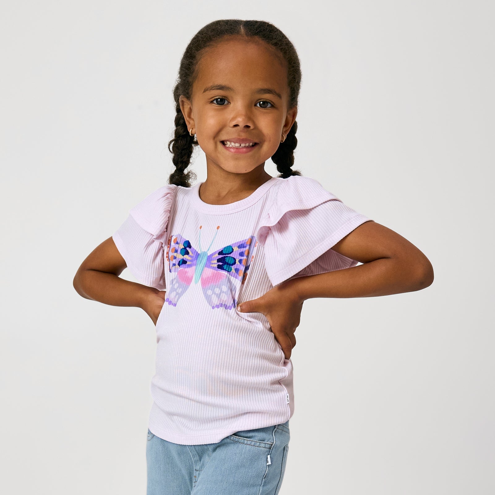 Double the flutter, double the fun! The Butterfly Double Flutter Tee features a dreamy butterfly graphic on super-soft ribbed Soluxe® Bamboo with the sweetest double flutter sleeves. This girls t shirt has a relaxed fit perfect for fluttering through school days. Mix & match with their fave LS bottoms!