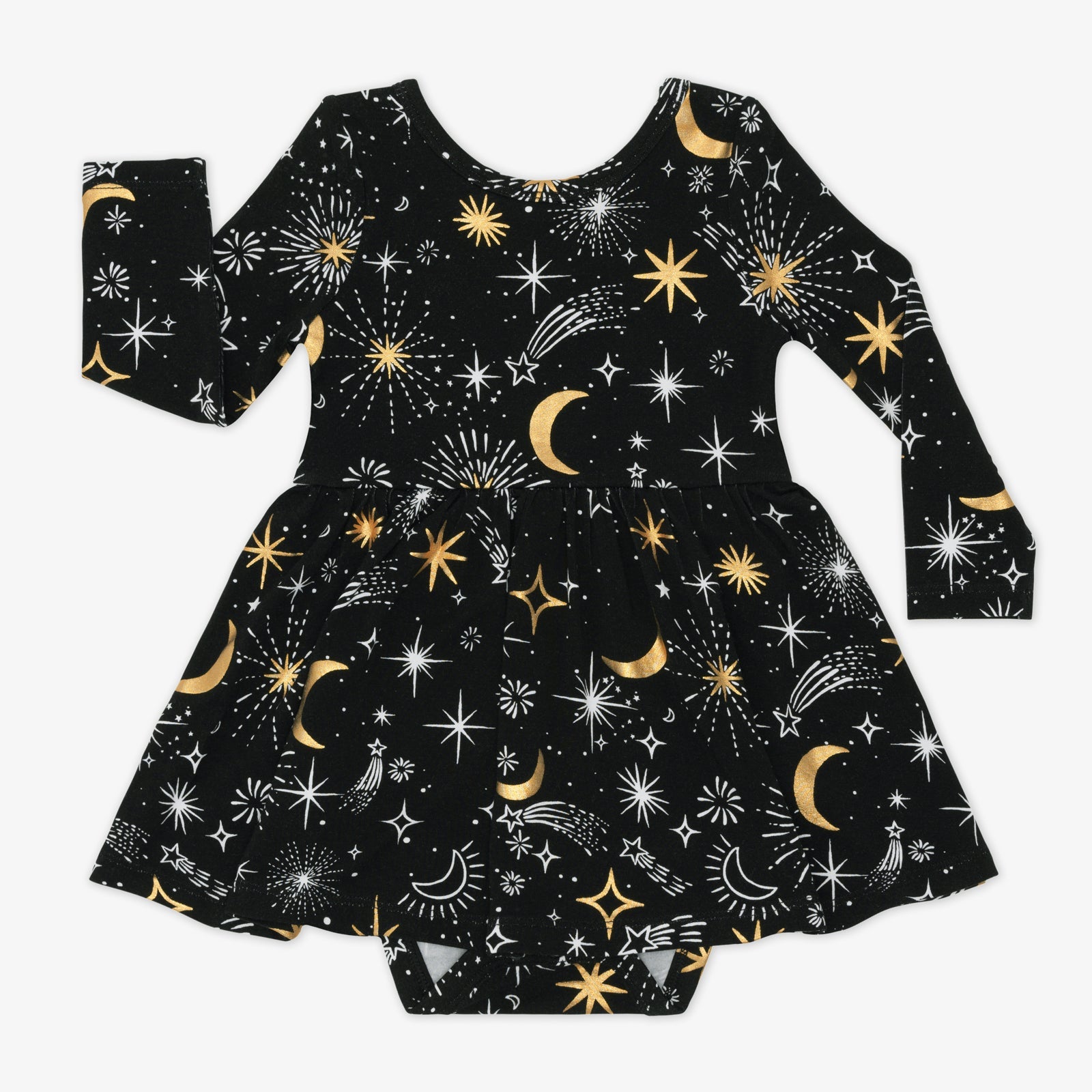 Let your little star twirl in our Celebration Stars Twirl Dress. Crafted from cozy Soluxe® Bamboo, this dress has a hidden snap bodysuit for easy changes and a full skirt made for magical spins under a starlit sky. Adorned with printed gold foil, it’s perfect for making New Year’s Eve extra special. Designed for dancing, play, and family matching moments, it’s an enchanting addition to your little one’s style lineup!
