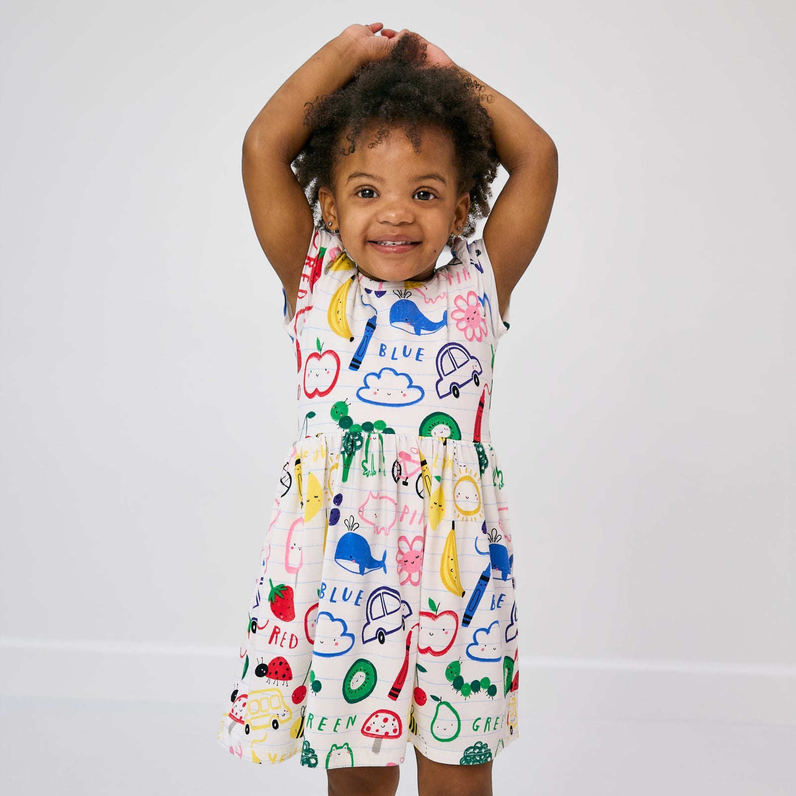 Doodle the day away! The Coloring Crew Skater Dress with Bodysuit features adorable doodles and drawings your littles will love. Made from durable Soluxe® Bamboo, this toddler dress features a hidden snappable bodysuit for easy diaper changes. Perfect for preschool days and sweet sibling matching!