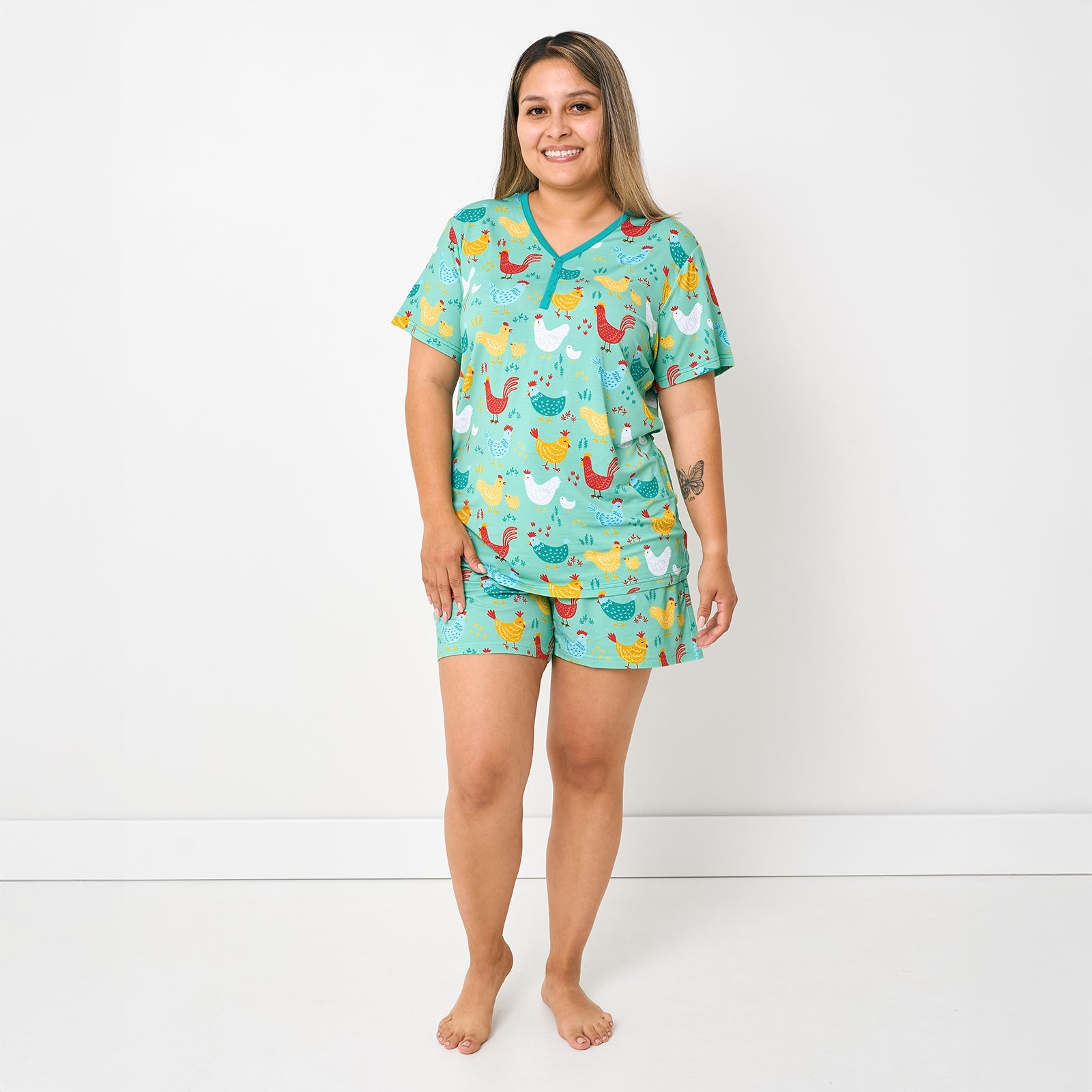 Snuggle up with your little chicks in matching Cozy Coop PJs! Featuring roosters, chickens, and their baby chicks roaming across a blue barnyard, these Women’s Pajama Shorts are perfect for lounging at home with the kiddos. Made from custom-milled Lunaluxe® Bamboo with deep side pockets for mama must-haves, a flowy style, and a comfy drawstring waist for a fit that’s just right. Pair it with the matching top, then snag styles for the whole coop!