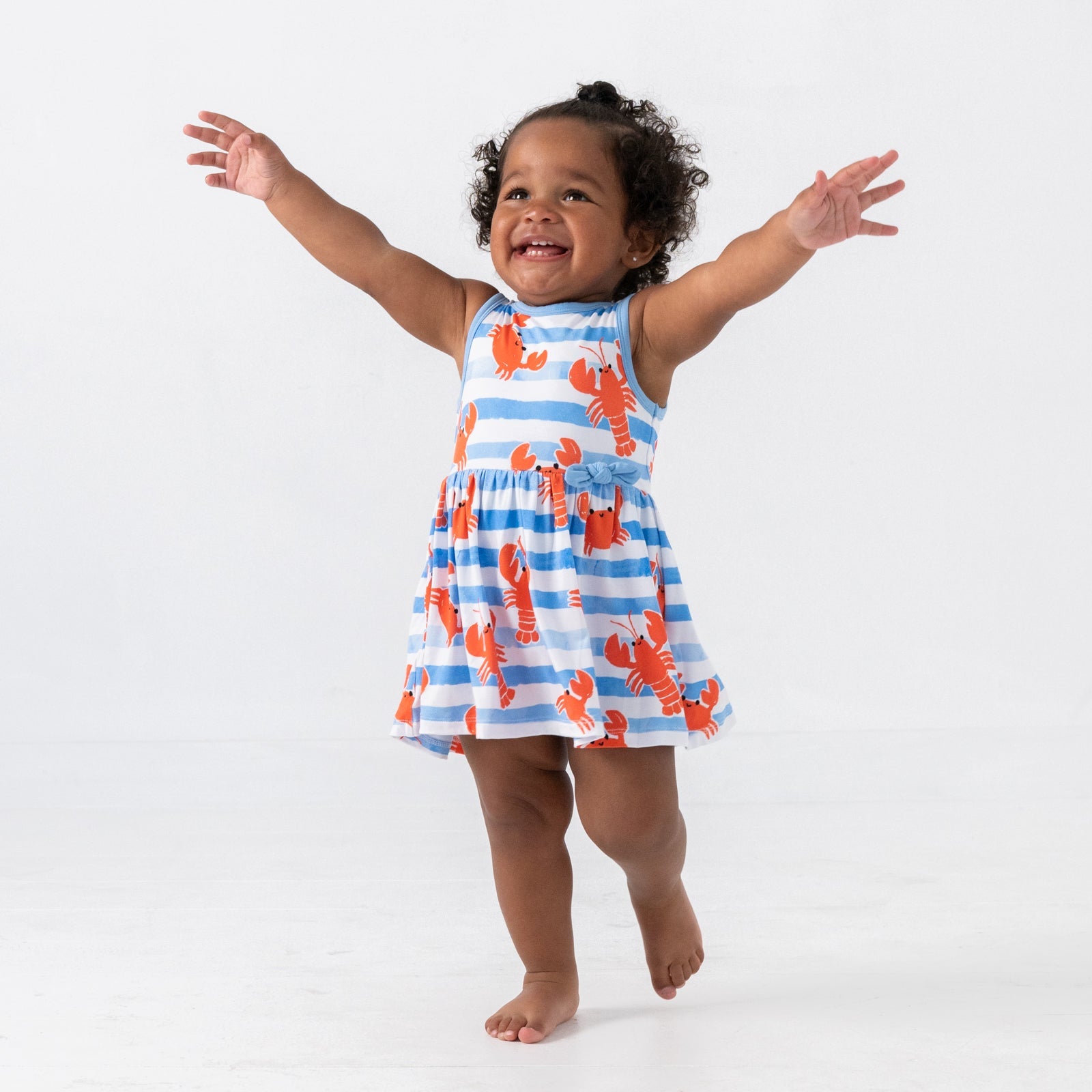 Crabby never looked so cute! The Crustacean Crew Skater Dress is made from durable and soft Soluxe® Bamboo — perfect for crawling or cuddles! With a built-in snappable bodysuit and straight-across hem that shows off every smiling crab and lobster, this Play-ready piece brings a pinch of fun to sibling matching moments or special occasions.