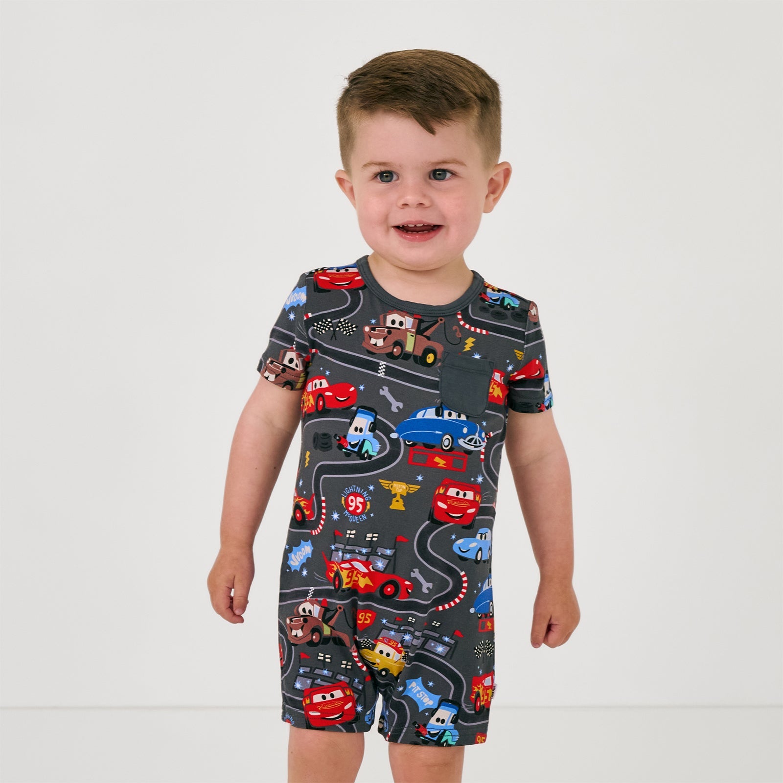 Race ya to it! Your little speedster will love this Disney & Pixar Cars baby romper featuring their fave pit crew characters. The Piston Cup Pocket Shorty Romper is made from durable Soluxe® Bamboo with hidden snaps for speedy diaper changes. Its front pocket is perfect for storing tiny racecars, and the relaxed fit means extra comfort for crawling around. Perfect for family matching and the ultimate pit crew look!
