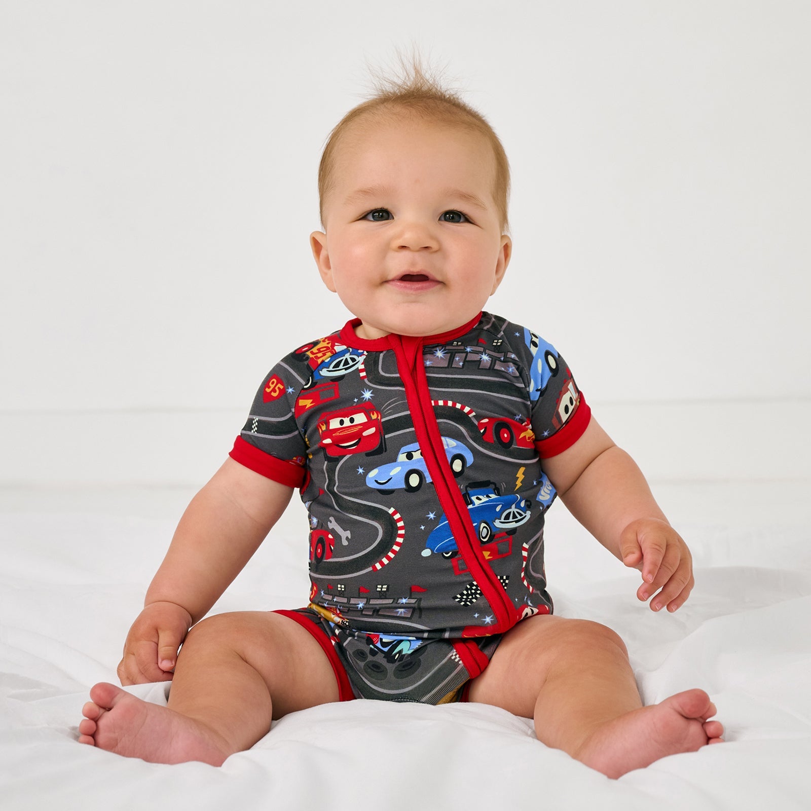 Your little one will be racing to bed in these Disney & Pixar Cars bamboo baby pajamas! Made from our buttery soft Lunaluxe® Bamboo, this Shorty Zippy is gentle on sensitive skin and perfect for warmer weather. With a double zipper for quick changes, bedtime is as smooth as a pit stop. Featuring Pixar’s Lightning McQueen, Mater, Luigi, and more of your fave characters. Perfect for fueling sweet dreams of racing adventures!