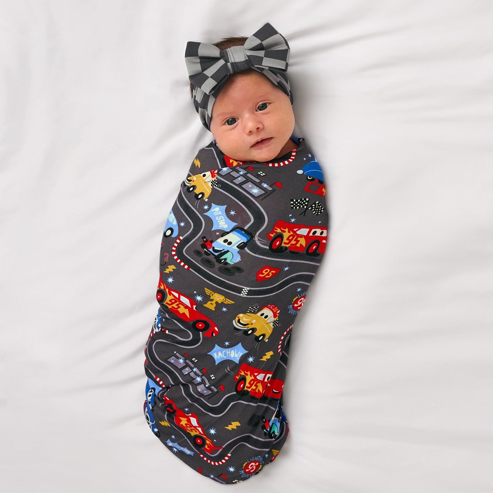 Welcome to the winner's circle, little racer! This Disney & Pixar Cars layette set showcases Pixar’s Lightning McQueen and friends. Made from buttery soft Lunaluxe® Bamboo, the Piston Cup Swaddle & Luxe Bow Headband Set is oh-so soft on newborn skin. The versatile swaddle comes with a coordinating bow headband that never needs tying! Packaged in our signature peekaboo gift box, it's ready to race straight to any new parent's heart.