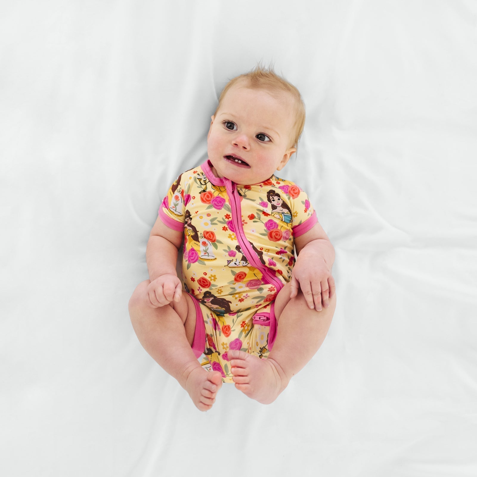 For your little princess! Our Disney Princess Belle Shorty Zippy features Disney’s Belle with her friends surrounded by roses. The breathable Lunaluxe® Bamboo fabric keeps your little princess comfy year round, while the double zipper makes diaper changes a breeze. No scratchy tags ensures a peaceful night’s sleep. Don’t forget a matching Princess Belle Lovey for enchanting photo ops!