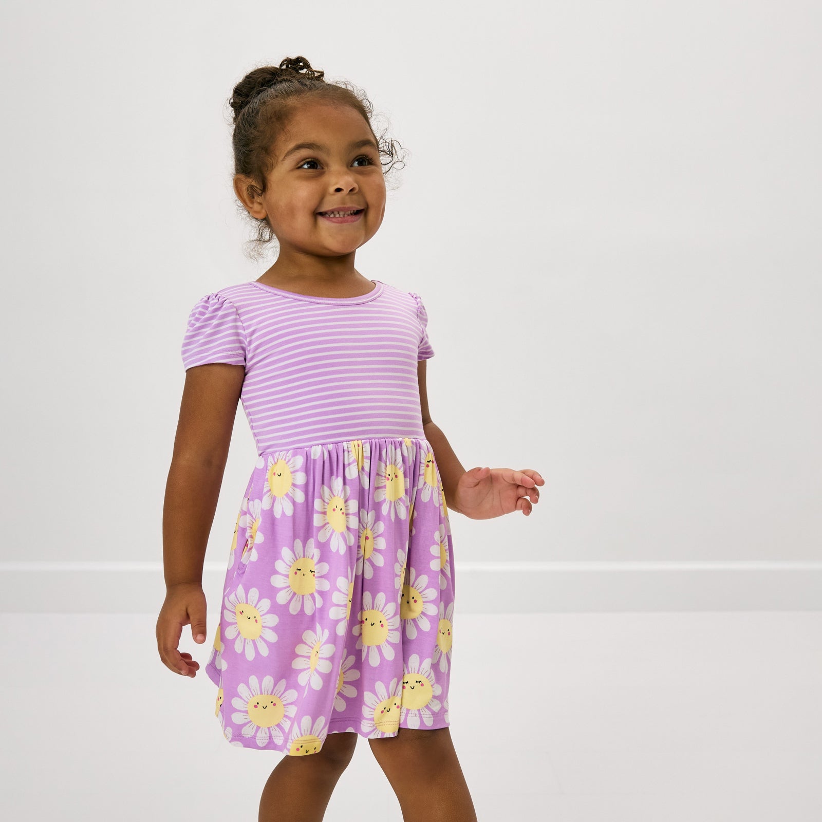 Twirl through the flower fields! The Flower Power Skater Dress features cheerful daisies with smiling faces your little optimist will love. Made from durable Soluxe® Bamboo with two side pockets for storing treasures, this girls dress is perfect for first days and recess Play. Grab coordinating styles for sibling matching!