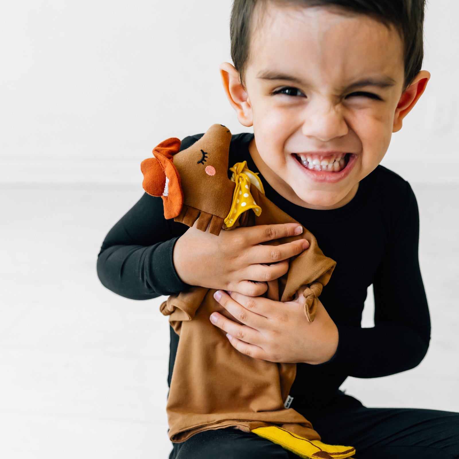 Harley the Horse is the most stylish snuggle buddy in the bunch! Featuring a plush stuffie head with our signature sleepy eyes & a brown blanket made from buttery soft bamboo viscose. Harley steals the show with a cowboy hat, bandana & cute yellow boots!