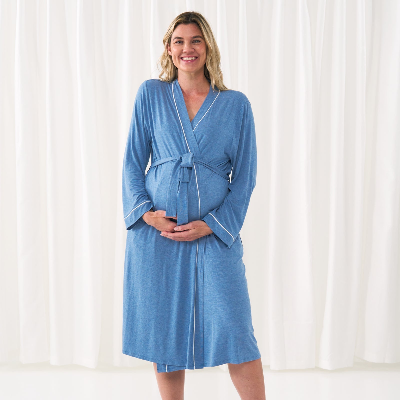Our women’s robes are designed for each stage of mama-hood — but also, just everyday coziness! Made from buttery soft Lunaluxe® Bamboo, this comfy Heather Blue Robe has deep pockets for all your essentials, an adjustable belt, and contrast piping for a cute and classic look.