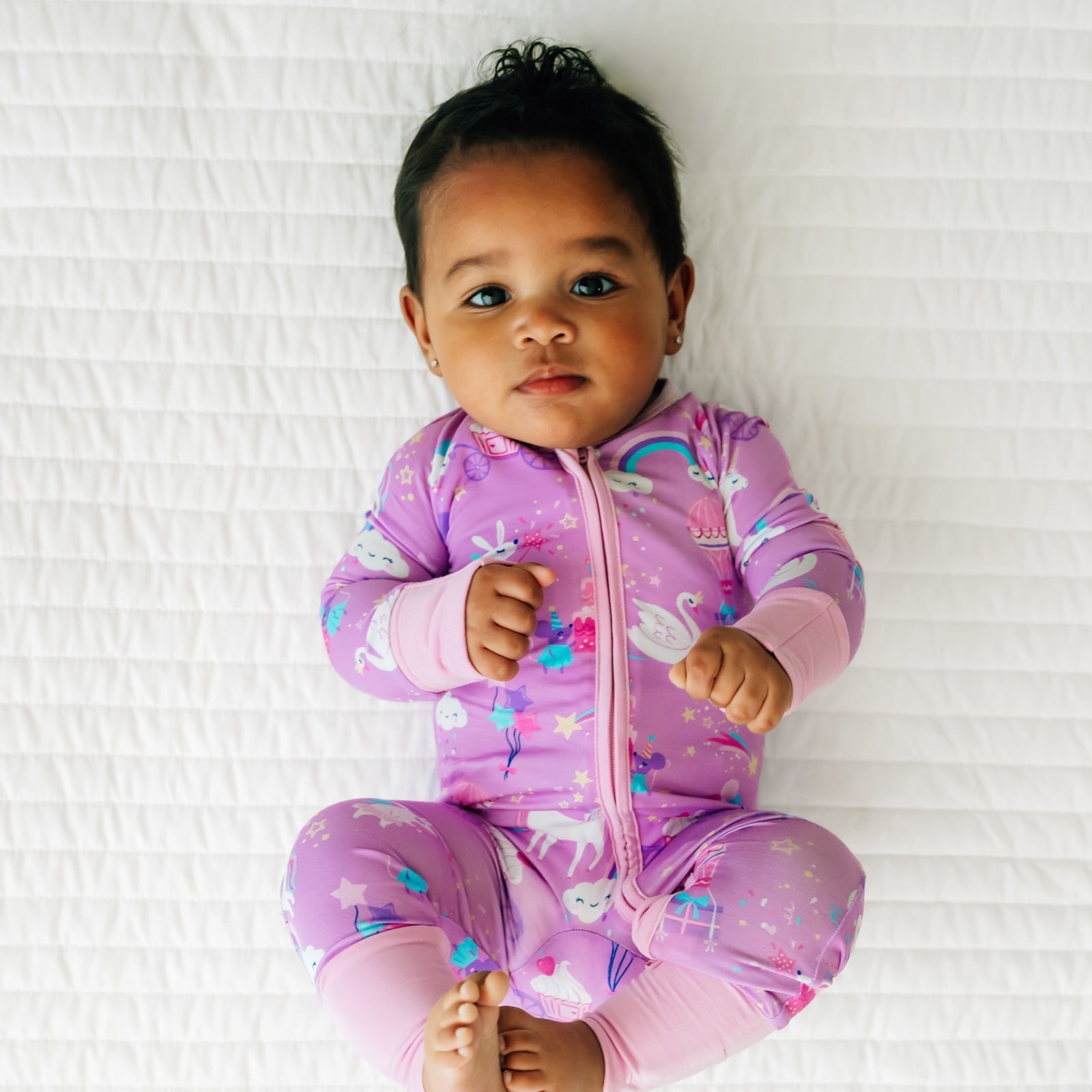 Here’s to a magical birthday! This one-piece zipper pajama features unicorns, cakes, rainbows & more on a pretty purple background. Made from buttery soft Lunaluxe® Bamboo, with thoughtful features like fold-over feet & mittens, a 2-way zipper and no scratchy tags. Just the perfect birthday outfit — or birthday gift!