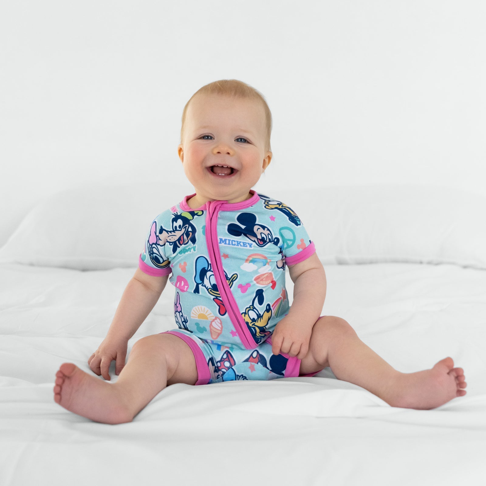 Let Disney’s Mickey Mouse, Minnie Mouse, Goofy, and more bring smiles to bedtime in our Disney Mickey’s Clubhouse Shorty Zippy! Featuring sticker-style peace signs, rainbows, and stars on a light denim-inspired backdrop with pink trim, it’s made from buttery soft Lunaluxe® Bamboo that’s gentle on sensitive skin. With a double zipper for easy changes, this short-sleeve sleeper is perfect for Disney-inspired fun. Snag adult styles for mommy-and-me matching!