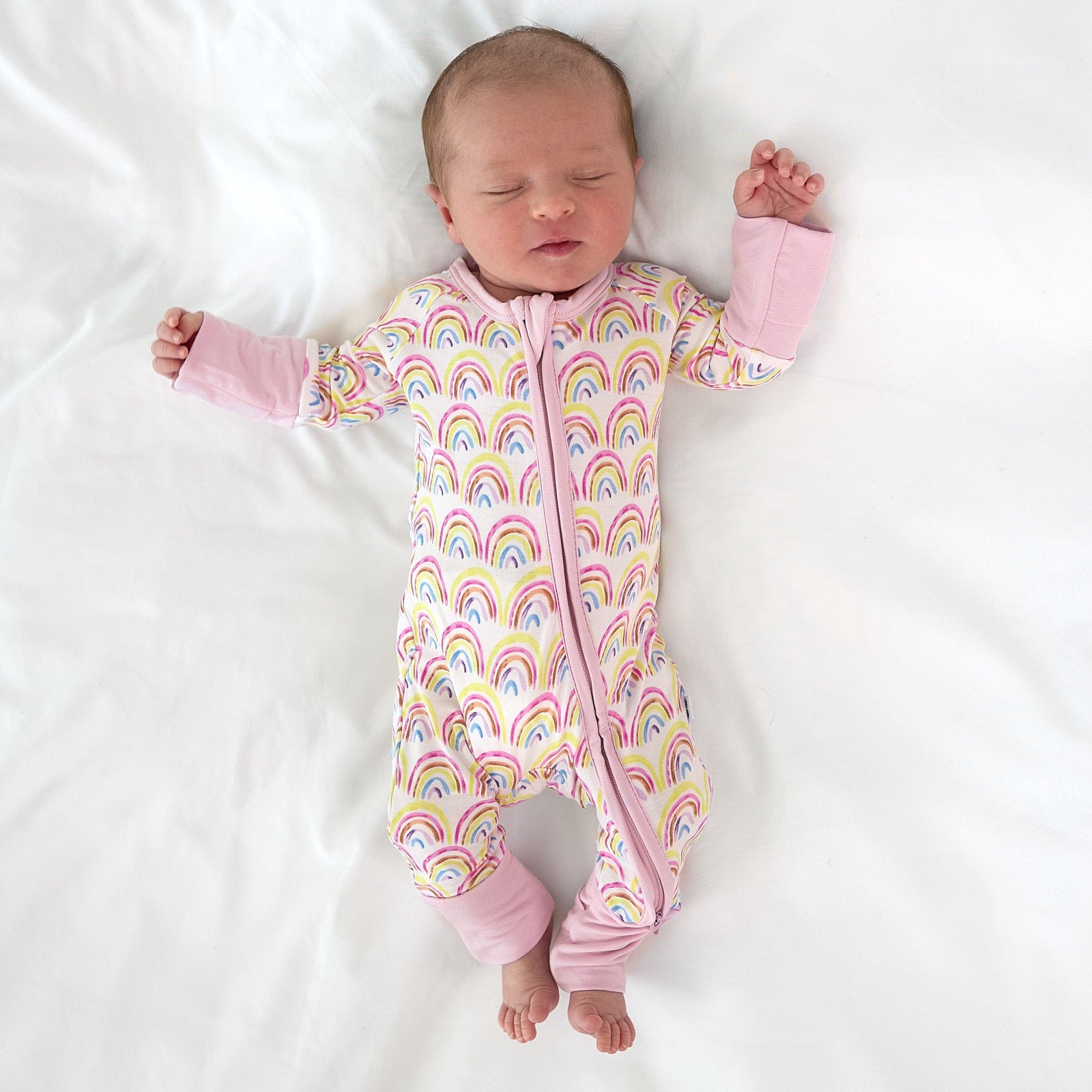 Sweet dreams are just over the rainbow in this Zippy! Featuring pastel rainbows on a white background with a light pink trim, it will be an instant fave in your PJ rotation. Made from our signature Lunaluxe® Bamboo with thoughtful features like fold-over feet & mittens, a 2-way zipper, and no scratchy tags. Don’t forget a matching Luxe Bow for the cutest photos!