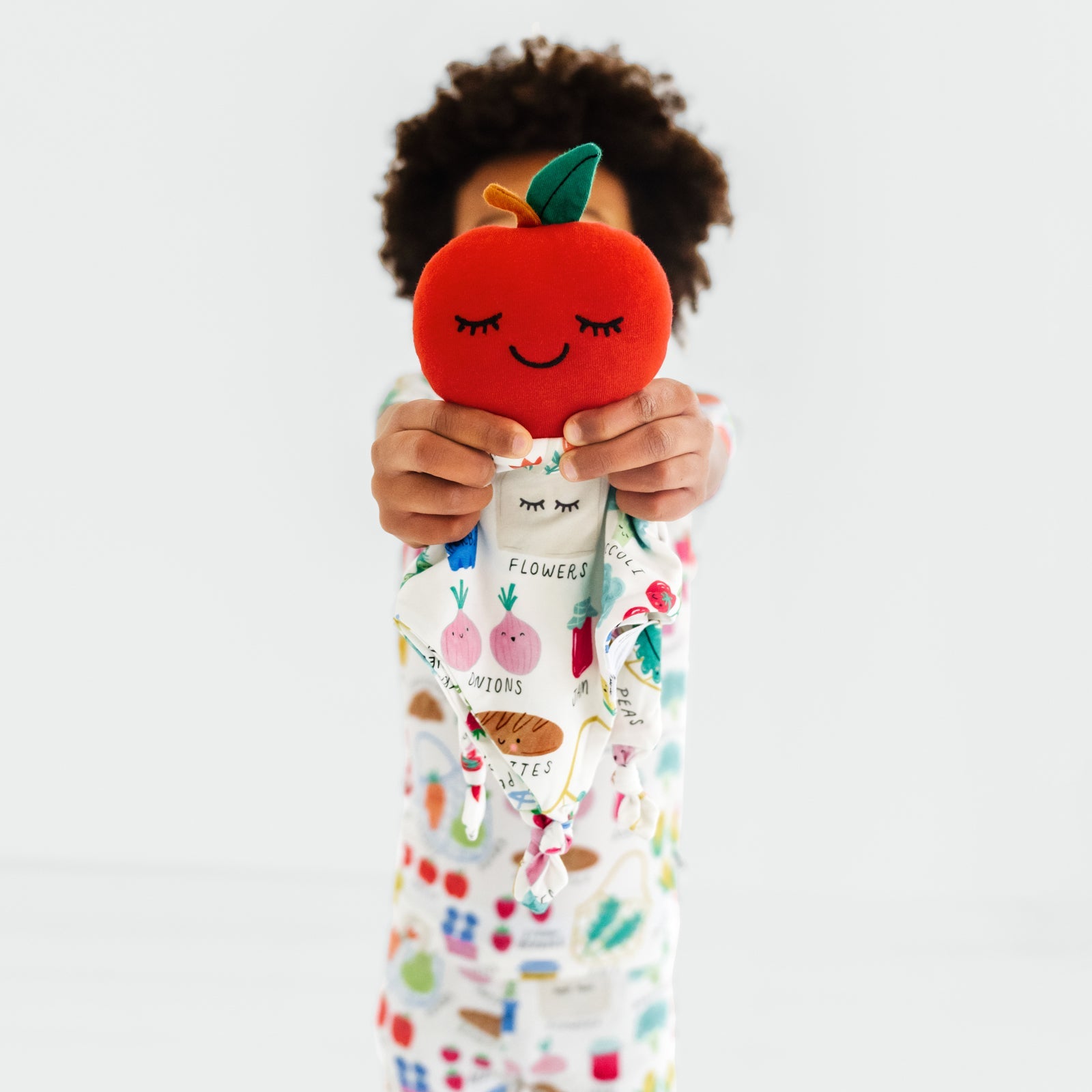 Fresh from the market and ready for fun! Ruby the Apple features an adorable blanket adorned with whimsical fruits, veggies, and baked goods, complete with a plush red apple on top. Designed for cuddly adventures, this Sleepyhead Lovey is crafted from soft bamboo fabric that’s delicate on skin. Perfect for cuddles or Play, it’s a cozy companion for your little one’s sweetest moments.