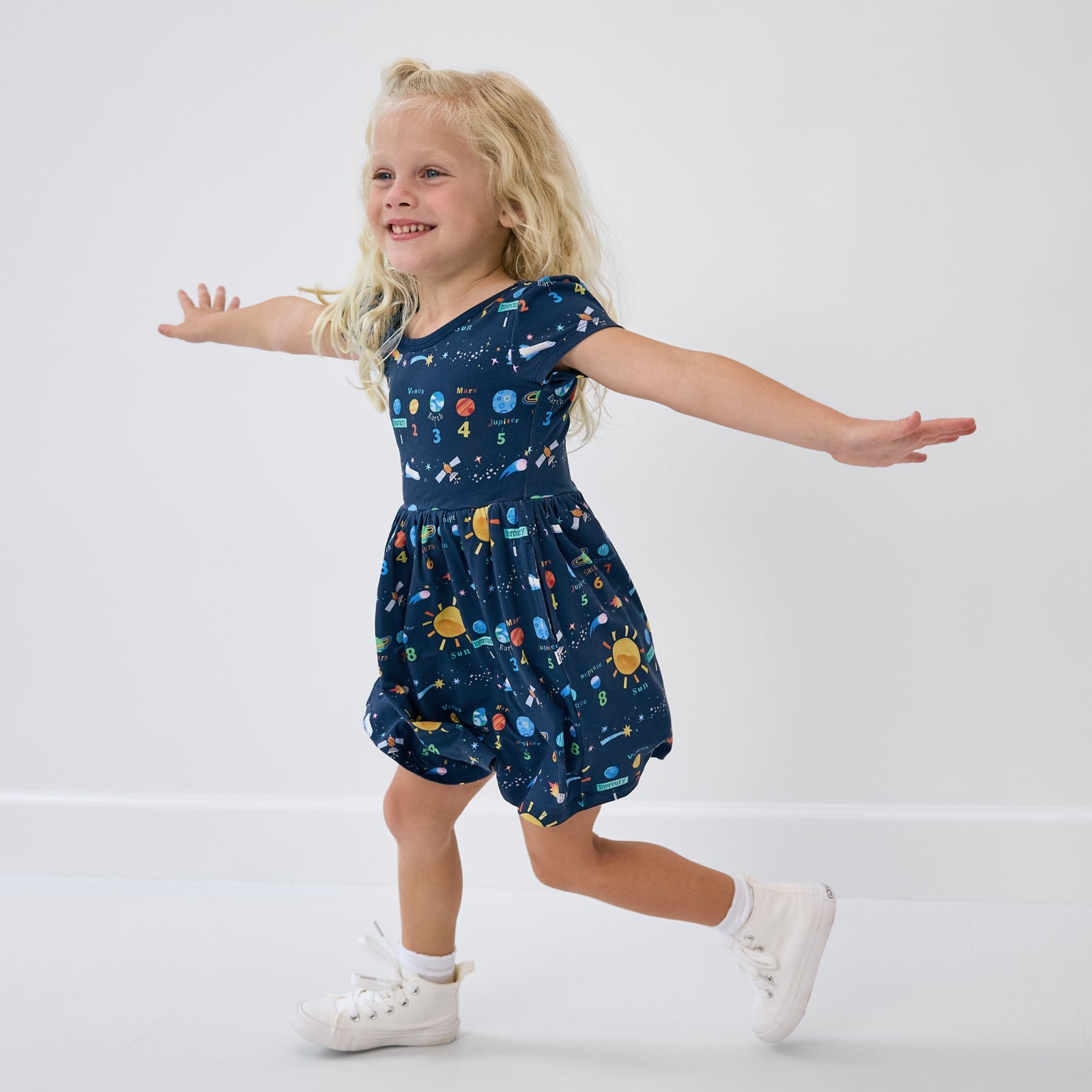 Space academy style! The Solar Explorers Skater Dress features solar system wonders to inspire your little learner. Made from durable Soluxe® Bamboo with two side pockets for storing treasures, this girls dress is perfect for field trips to the planetarium and first-day photos. Grab it in more styles for sibling matching!