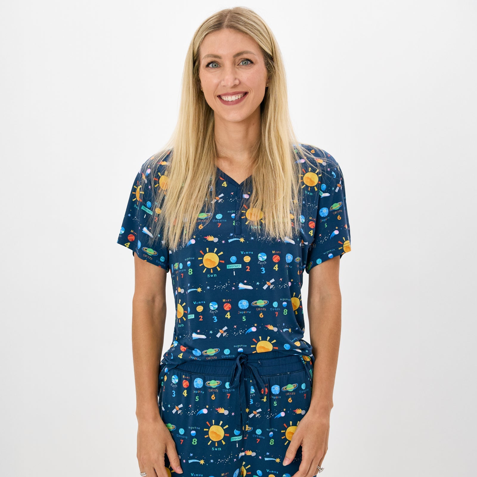 Shoot for the stars, mama! The Solar Explorers Women's Pajama Top features solar system wonders on buttery soft Lunaluxe® Bamboo. This women's bamboo pajama top has a relaxed V-neck, short sleeves, and snap-front placket for easy nursing. Pair with the matching pants for out-of-this-world coziness!