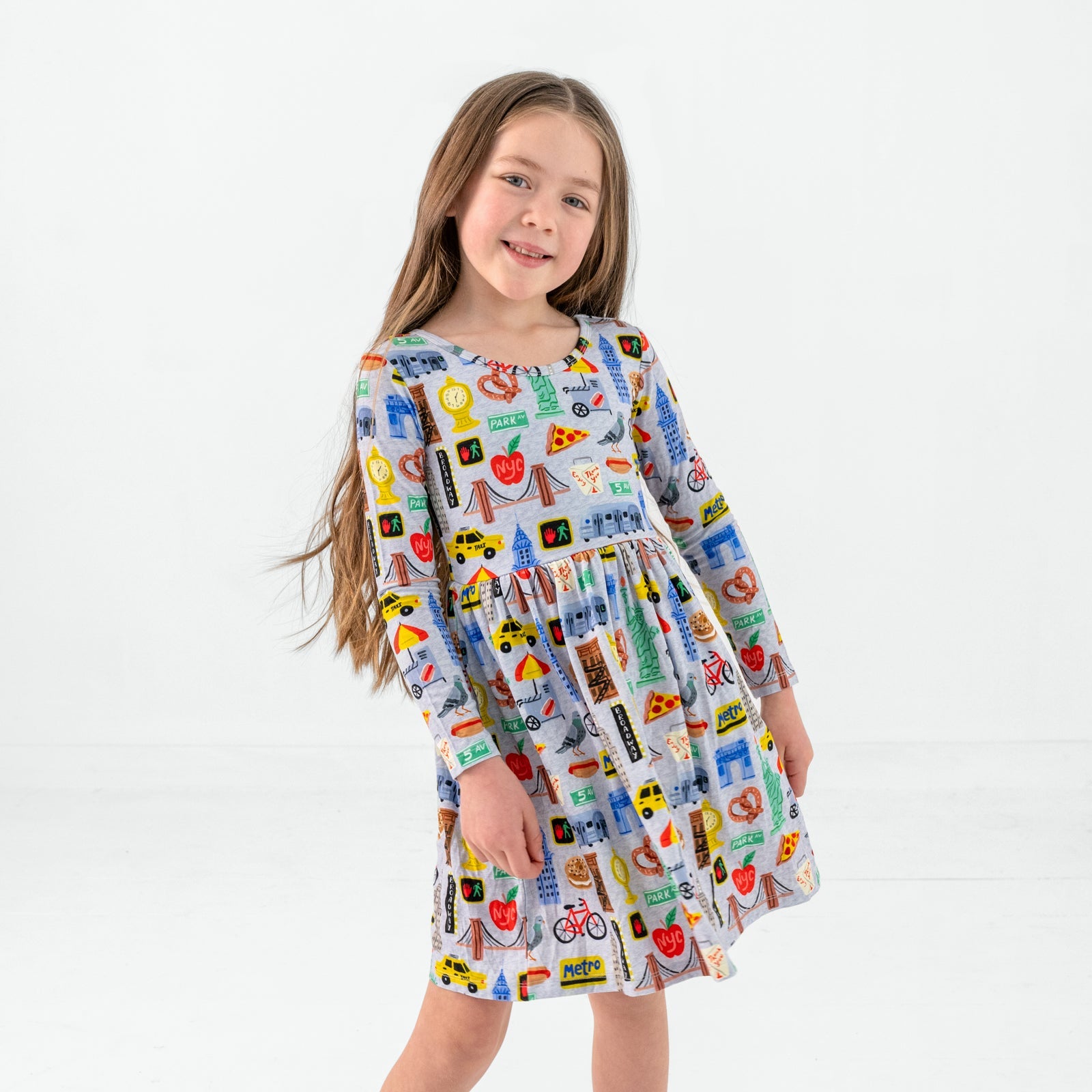 Twirl into the city that never sleeps! The Big Apple Skater Dress is designed with NYC magic, featuring hand-painted icons like yellow cabs, bagels, and the Statue of Liberty. Made from soft and durable Soluxe® Bamboo, it’s equal parts comfy and charming. With a lined bodice, knee-length hem, and side pockets for little treasures, it’s an adorable pick for sibling matching on city adventures!