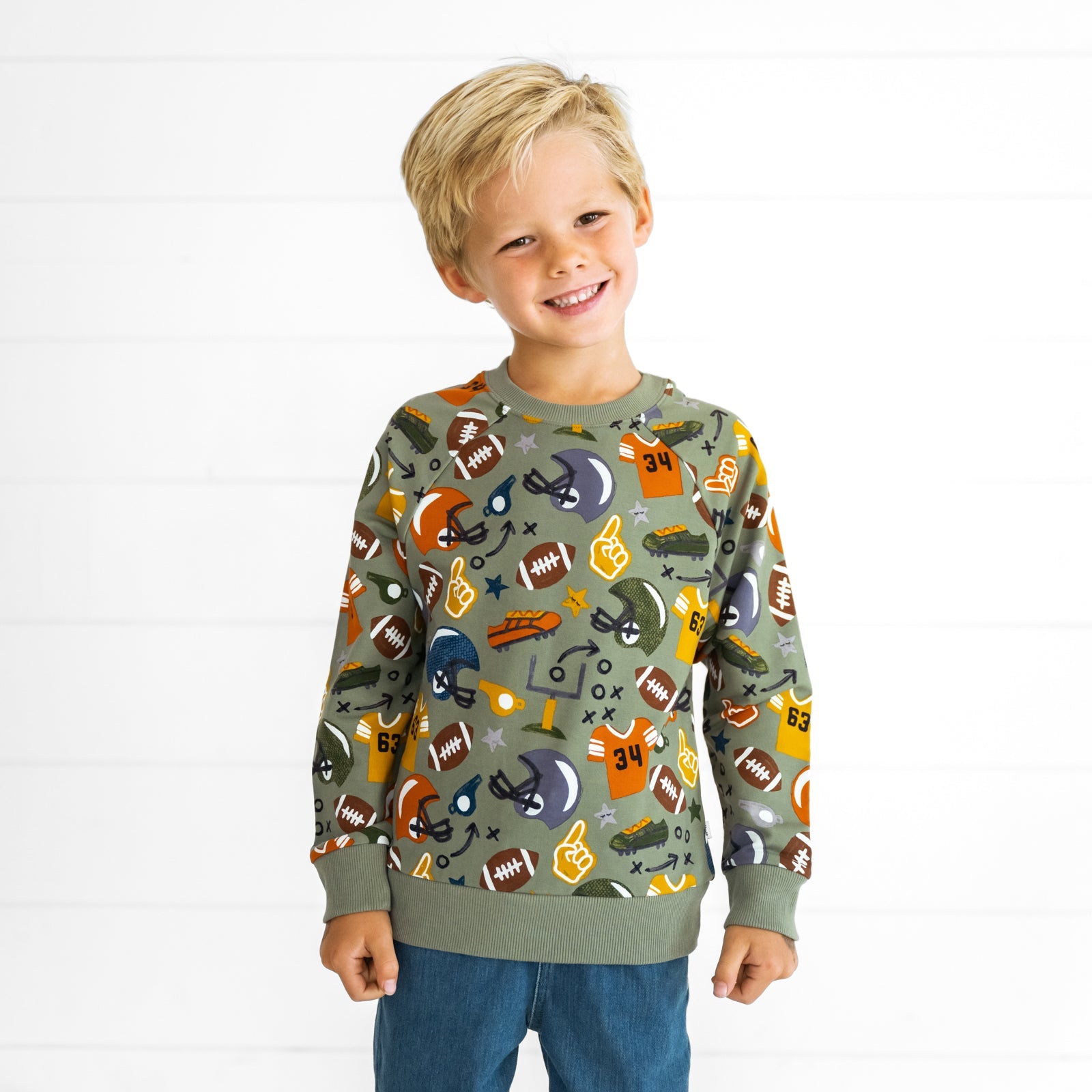 It’s Touchdown Time! This sporty Crewneck Sweatshirt is ready for your little quarterback’s big adventures. Featuring hand-painted helmets, goalposts, and more on a grass green background, it’s crafted from soft and durable Soluxe® Bamboo for all-day comfort. With a relaxed fit that’s perfect for Play, this trendy sweatshirt is a win both on and off the field. Pair it with your fave LS joggers for a cozy-cute look!